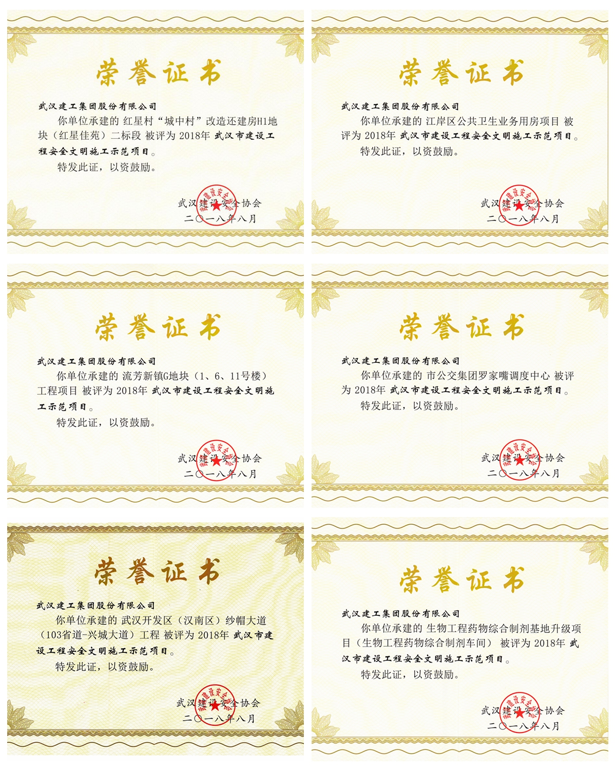 2018年8月13日,武漢建筑業(yè)協(xié)會(huì)公布武漢市2017年度建設(shè)工程黃鶴獎(jiǎng)評(píng)選結(jié)果,武漢建工集團(tuán)股份有限公司承建的武漢建工科技中心、長(zhǎng)江傳媒大廈2個(gè)工程項(xiàng)目獲武漢市建設(shè)工程黃鶴獎(jiǎng)金獎(jiǎng),天匯龍城二期(G地塊)、鳳凰商業(yè)服務(wù)中心、智苑小區(qū)還建社區(qū)、常青上蓋物業(yè)一期、長(zhǎng)江航道
