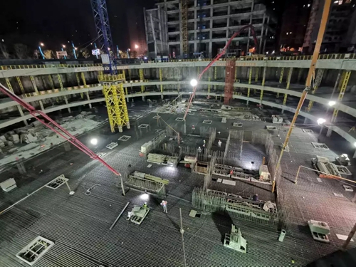 2019年5月5日凌晨一點(diǎn),武漢建工總承包建設(shè)的武漢市軌道交通七號(hào)線(xiàn)一期三陽(yáng)路風(fēng)塔配套綜合開(kāi)發(fā)項(xiàng)目二期工程開(kāi)始了11000立方米大體積混凝土澆筑施工作業(yè),預(yù)計(jì)四天完工。