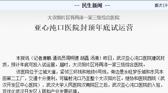 大漢陽片區(qū)將再添一家三級(jí)綜合醫(yī)院,亞心沌口醫(yī)院封頂年底試運(yùn)營!(載《長江日報(bào)》2017年3月27日第九版) 鏈接:http://cjrb.cjn.cn/html/2017-03/27/content_5601713.htm?from=groupme