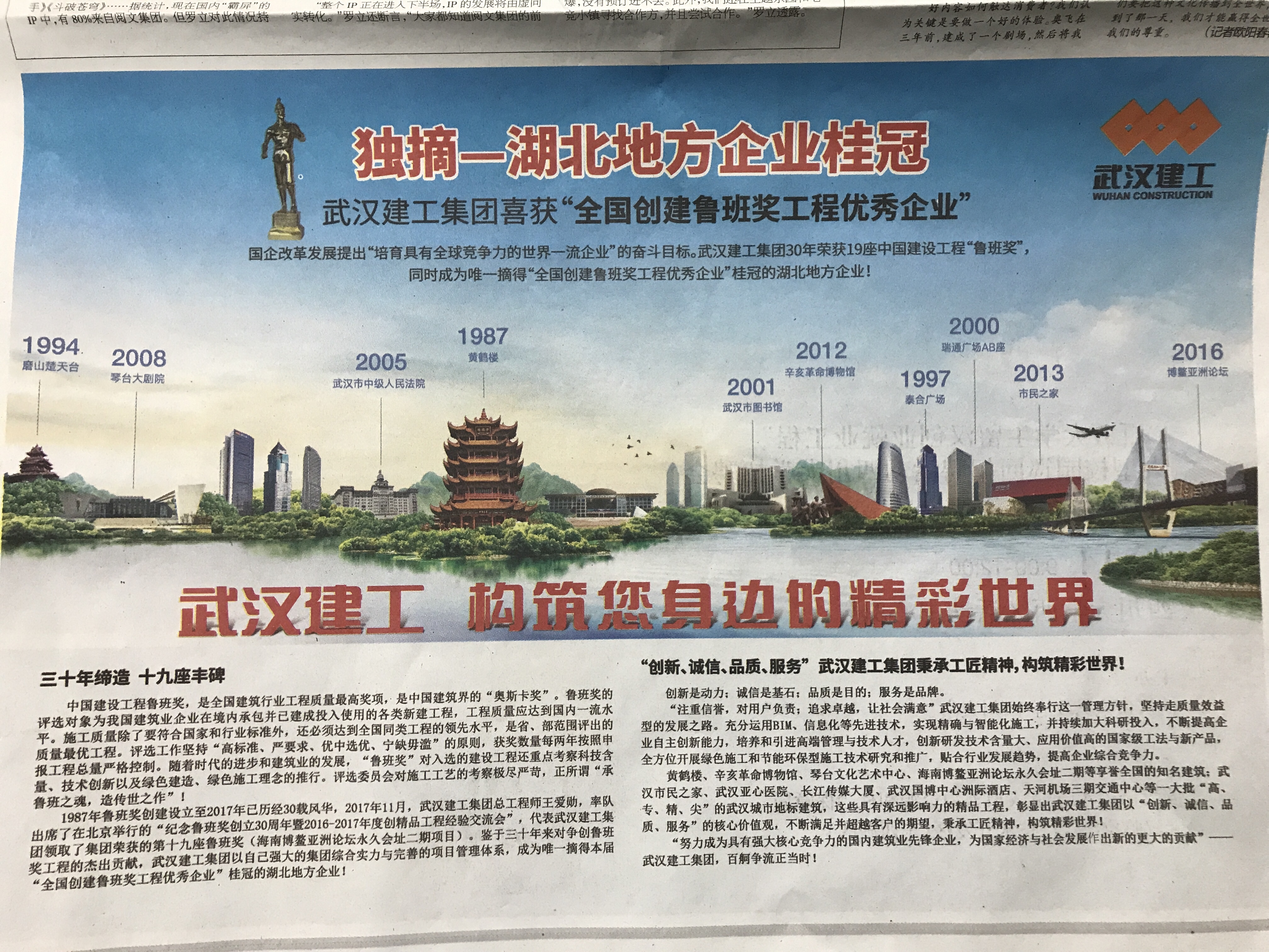 獨(dú)摘—湖北地方企業(yè)桂冠 武漢建工集團(tuán)喜獲“全國(guó)創(chuàng)建魯班獎(jiǎng)工程優(yōu)秀企業(yè)”