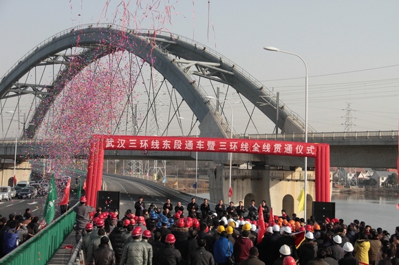 2010年12月30日,三環(huán)線東段暨全線正式通車,形成武漢市內(nèi)首條全線通車的快速環(huán)線通道。市政府在三環(huán)東段起點(diǎn)舉行了隆重的通車慶典,武漢建工的彩車載著武建人的喜悅和自豪行使在慶典的車隊(duì)之中,沿著寬闊和通暢的道路向前奔馳。